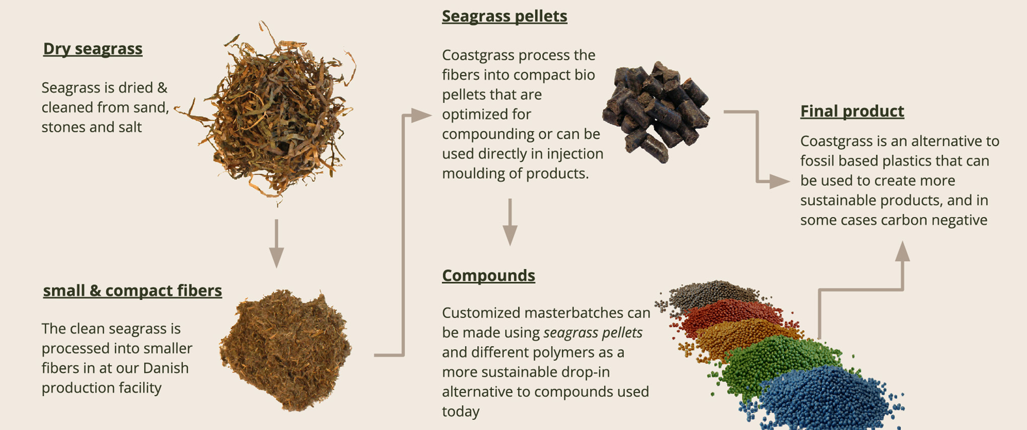 “Om 5 år vil de materialer, vi tilbyder, være priskonkurrencedygtige med ny bioplast og kunne tilpasses med hensyn til farver og egenskaber. Vi vil have en produktportefølje bestående af en række materialer med forskellige fibertyper, fiberbelastning, visuelt udseende og egenskaber. Det betyder, at Coastgrass kan imødekomme en masse forskellige behov og sektorer med forskellige produkter,” lyder ambitionen fra stifterne.